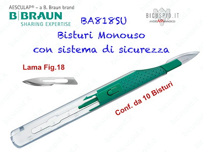 BA818SU Bisturi Monouso Con Lama Fig. 18 con sistema di sicurezza - - BBraun Aesculap Il prezzo indicato è di 1 bisturi - Venduta in Box da 10 bisturi o multipli