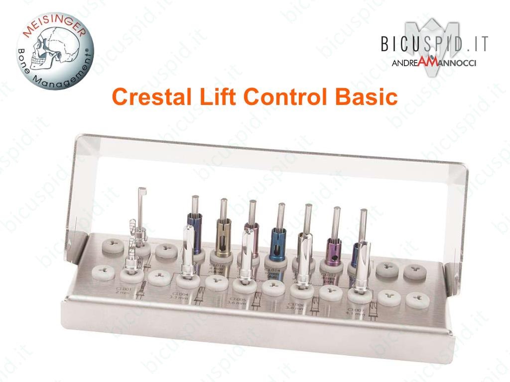 Inoltre, il sistema di boccole di arresto, progettato per gli strumenti speciali, previene lesioni o perforazioni della membrana di Schneider. Crestal-Lift-Control Basic è un sistema entry-level con una strumentazione ridotta rispetto al kit completo