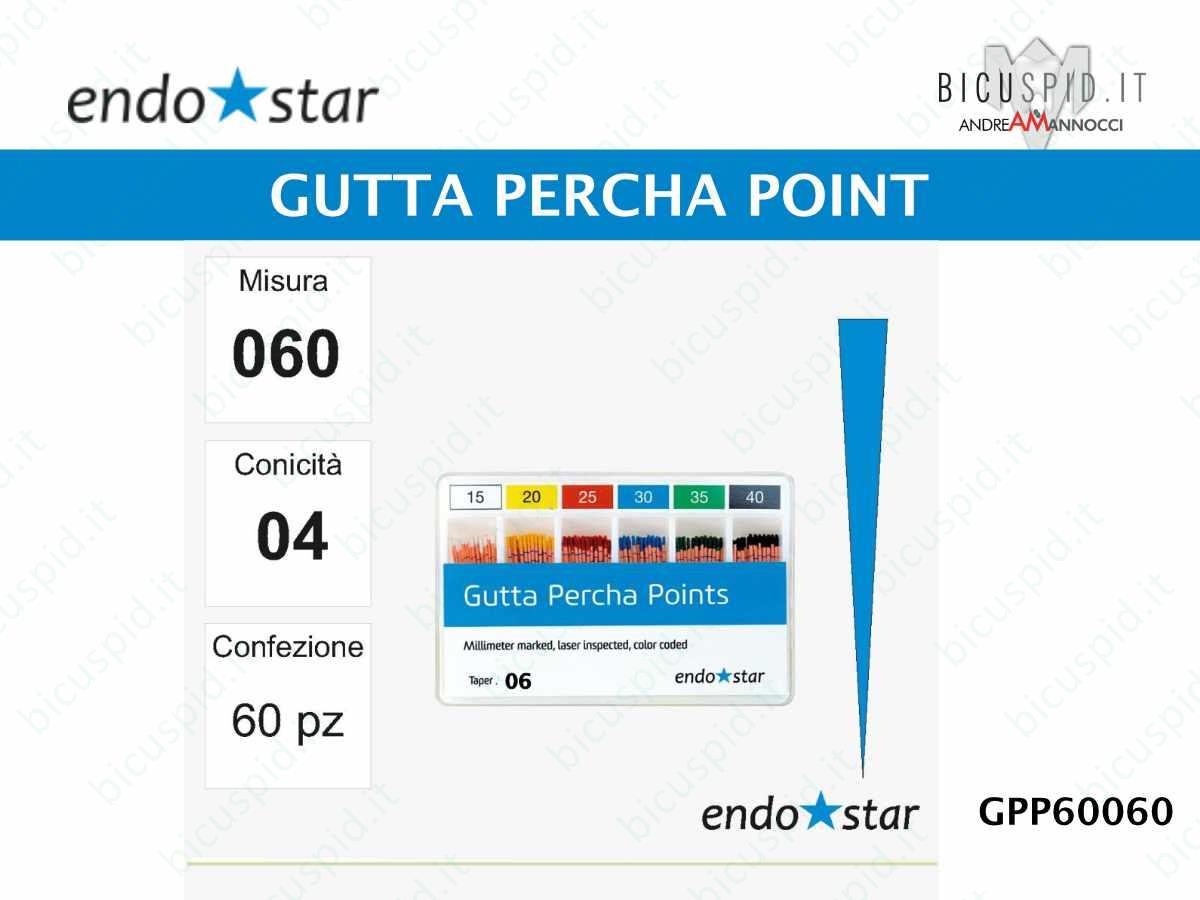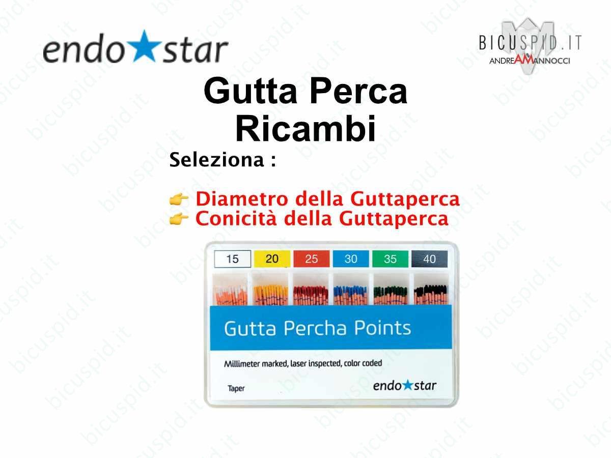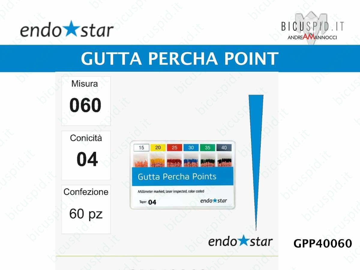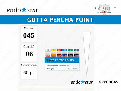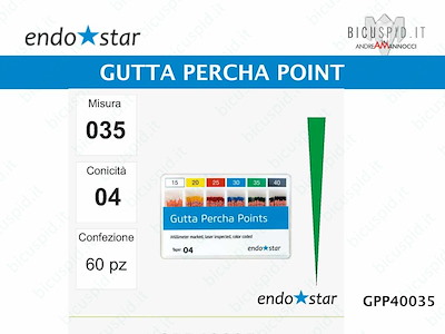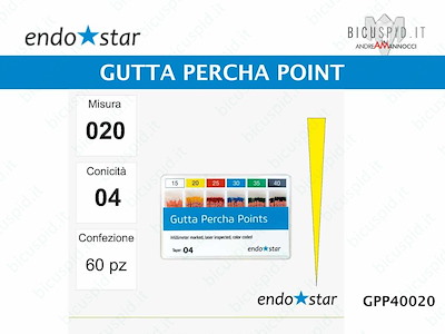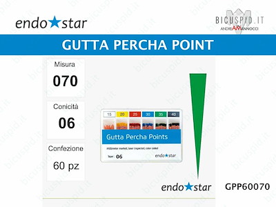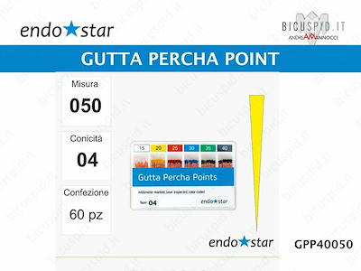 Coni di Gutta Percha per l'otturazione dei canali radicolari, codificati ISO.