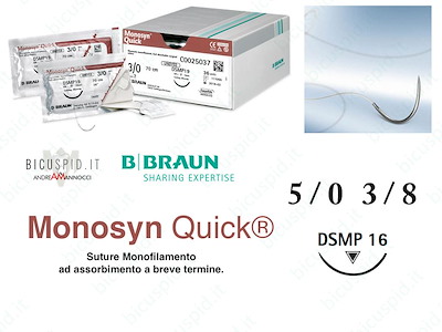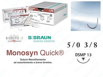 Monosyn Quick 5/0 - 3/8 di Cerchio - Sutura Monofilamento ad Assorbimento Rapido BBraun Colore della Sutura: Incolore Lunghezza della Sutura : 45 cm e 70 cm Confezione da 12 e 36 Suture