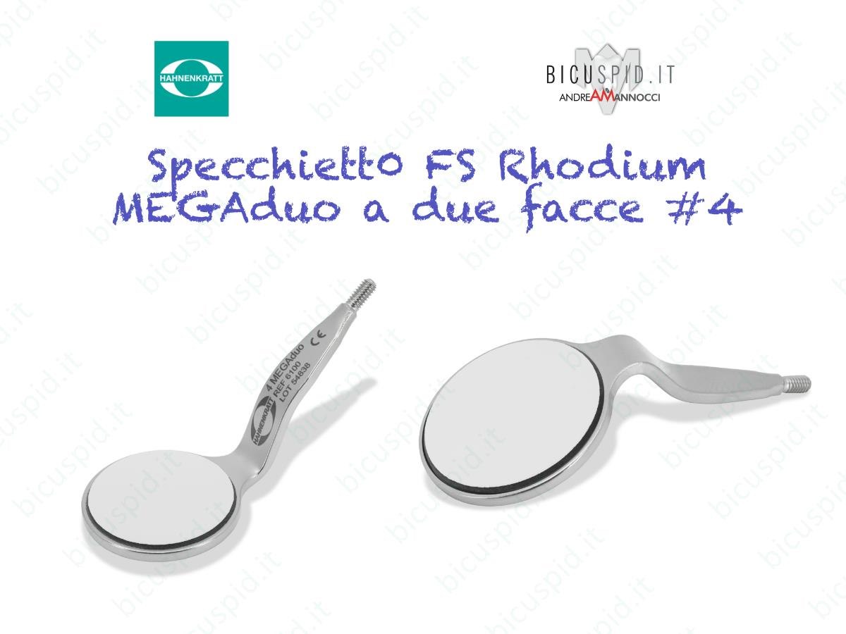 Progettati con un disegno sottile ma estremamente robusto, privo di saldature con il gambo, con una accurata rifinitura nel punto di contatto tra specchio e metallo. Questo specchietto è in grado di spingere la guancia utilizzandolo come divaricatore, riducendo il disagio per il paziente. La superficie metallica è satinata, per evitare riflessioni accessorie. La specchietto è FS Rhodium della Hahnenkratt, probabilmente il più raffinato specchietto rodiato in commercio